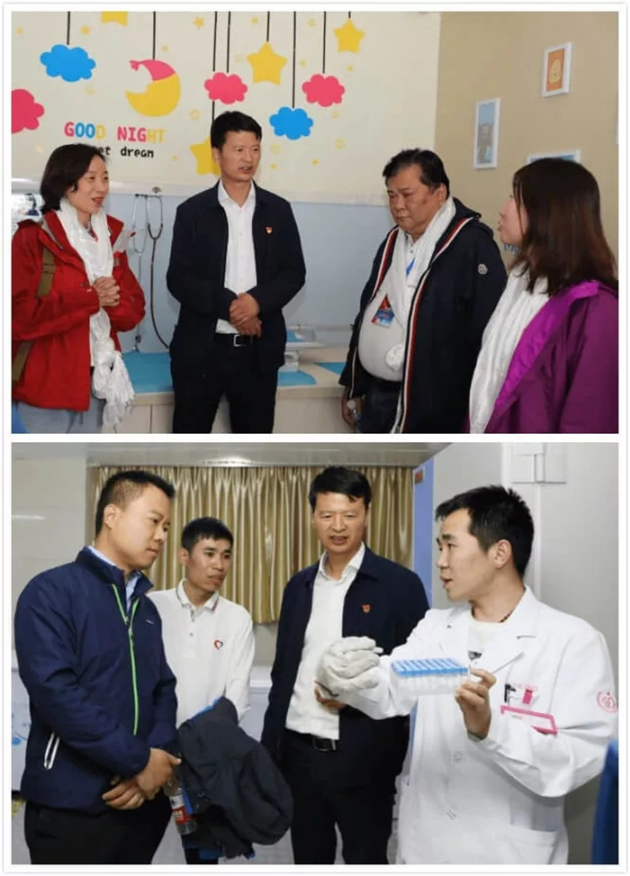 義診期間,中共中央統戰部七局處長郭鵬與"同心共鑄中國心”駐西藏秘書長趙士磊來到了阜康婦產兒童醫院詳細查看了正在井然有序進行的義診現場,在王斌董事長陪同下參觀阜康婦產兒童醫院院區,聽取并查看了我院人類輔助生殖醫學中心等特色科室的開展情況。