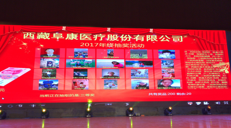 2018年1月10日,西藏阜康醫(yī)療股份有限公司新年團(tuán)拜會在拉薩洲際酒店舉行,下午四點(diǎn)來自西藏阜康醫(yī)院、婦產(chǎn)兒童分院、心腦血管分院、健康體檢中心、阜康大藥房、超市的員工陸續(xù)來到會場。下午五點(diǎn),主持人劉連福院長宣布會議正式開始,場內(nèi)音樂響起,董事長王斌帶領(lǐng)醫(yī)院領(lǐng)導(dǎo)和特邀嘉賓入場,會場立刻響起雷鳴般的掌聲和歡呼聲。
