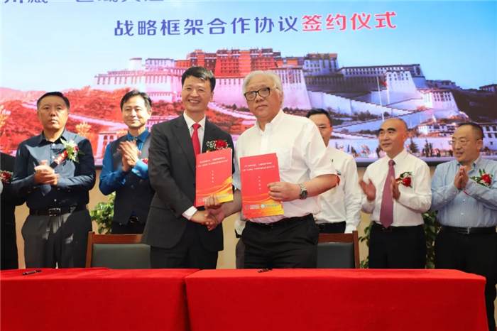 四川省腫瘤醫院黨委書記郎錦義,西藏阜康醫療股份有限公司黨委書記、董事長王斌代表雙方共同簽署《川藏區域共建四川省腫瘤醫院(集團)拉薩分院戰略框架合作協議》,隨后郎錦義書記向王斌董事長進行了授牌。