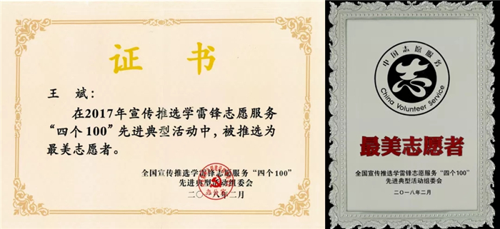 西藏阜康雪域天使志愿者服務隊隊長王斌,在2017年學雷鋒志愿服務"四個100”先進典型活動中,被推選為最美志愿者。